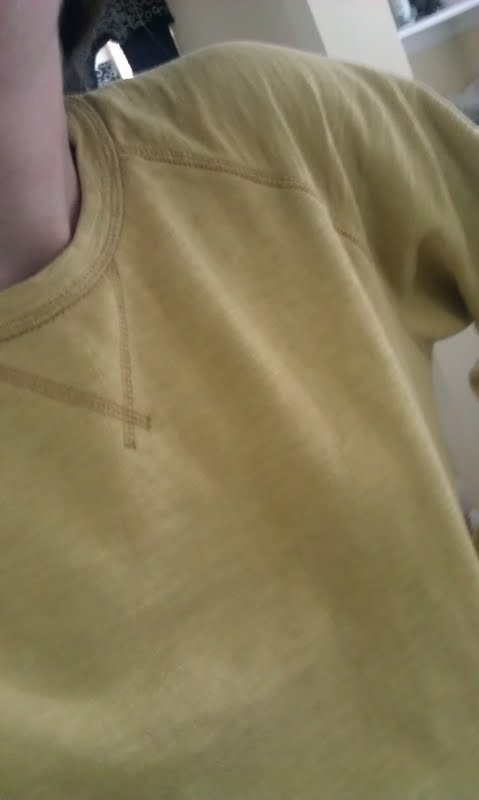 | Here is an outfit featuring a greige tee. I googled "how to take fashion photos for a blog" and read LOTS of EXCELLENT info. Stuff about side lighting and a short focal length (or was it a long focal length) and how to edit the background, etc - really quality information. But then instead I just took this photo with my phone while standing on my tip toes because I am more of a Tired Girl and less of a fashion blogger. And Yes, these are the same yellow jeans from the first photo and I do wear other things, but I just like these. The scarf I used to wear with this outfit was in my purse when it was stolen from me. So I have revamped it with the blue. |